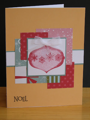 I did some random stamping around the outside with snowflakes from various stamp sets. Then the title and punched snowflakes are sprayed with homemade glimmer mist. The paper is from the Aspen paper pack.